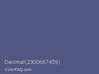 Decimal 2300667459 Color is a normal blue color and the nearest color is Purple Navy #4e5180. Hex code #515683 and RGB value is rgb(81,86,131). In RGB color space, this color is composed of 32% red, 34% green, 51% blue, In CMYK color space, this color is composed of 38% cyan, 34% magenta, 0% yellow , 49% black , In HSL color space, this color has a hue angle of 234° , 24% saturation and 42% lightness.