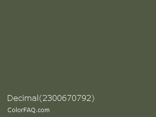 Decimal 2300670792 Color is a normal green color and the nearest color is Gray Asparagus #465945. Hex code #515944 and RGB value is rgb(81,89,68). In RGB color space, this color is composed of 32% red, 35% green, 27% blue, In CMYK color space, this color is composed of 9% cyan, 0% magenta, 24% yellow , 65% black , In HSL color space, this color has a hue angle of 83° , 13% saturation and 31% lightness.