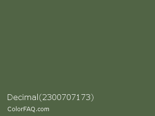 Decimal 2300707173 Color is a normal green color and the nearest color is Axolotl #4e6649. Hex code #516445 and RGB value is rgb(81,100,69). In RGB color space, this color is composed of 32% red, 39% green, 27% blue, In CMYK color space, this color is composed of 19% cyan, 0% magenta, 31% yellow , 61% black , In HSL color space, this color has a hue angle of 97° , 18% saturation and 33% lightness.
