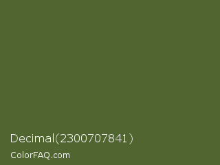Decimal 2300707841 Color is a dark green color and the nearest color is Dark Olive Green #556b2f. Hex code #516531 and RGB value is rgb(81,101,49). In RGB color space, this color is composed of 32% red, 40% green, 19% blue, In CMYK color space, this color is composed of 20% cyan, 0% magenta, 51% yellow , 60% black , In HSL color space, this color has a hue angle of 83° , 35% saturation and 29% lightness.
