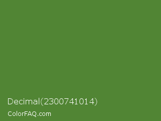 Decimal 2300741014 Color is a normal green color and the nearest color is Sap Green #507d2a. Hex code #518534 and RGB value is rgb(81,133,52). In RGB color space, this color is composed of 32% red, 52% green, 20% blue, In CMYK color space, this color is composed of 39% cyan, 0% magenta, 61% yellow , 48% black , In HSL color space, this color has a hue angle of 99° , 44% saturation and 36% lightness.