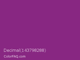 Decimal 143798288 Color is a normal magenta color and the nearest color is Razzmic Berry Crayola #843179. Hex code #882782 and RGB value is rgb(136,39,130). In RGB color space, this color is composed of 53% red, 15% green, 51% blue, In CMYK color space, this color is composed of 0% cyan, 71% magenta, 4% yellow , 47% black , In HSL color space, this color has a hue angle of 304° , 55% saturation and 34% lightness.