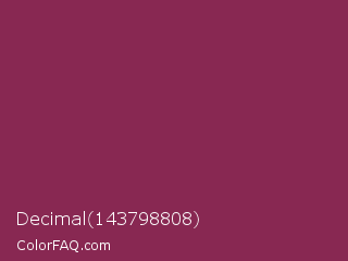 Decimal 143798808 Color is a normal rose color and the nearest color is Dark Raspberry #872657. Hex code #882852 and RGB value is rgb(136,40,82). In RGB color space, this color is composed of 53% red, 16% green, 32% blue, In CMYK color space, this color is composed of 0% cyan, 71% magenta, 40% yellow , 47% black , In HSL color space, this color has a hue angle of 334° , 55% saturation and 35% lightness.
