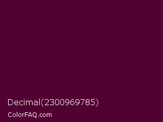 Decimal 2300969785 Color is a very dark magenta color and the nearest color is Blackberry #4d0135. Hex code #520133 and RGB value is rgb(82,1,51). In RGB color space, this color is composed of 32% red, 0% green, 20% blue, In CMYK color space, this color is composed of 0% cyan, 99% magenta, 38% yellow , 68% black , In HSL color space, this color has a hue angle of 323° , 98% saturation and 16% lightness.