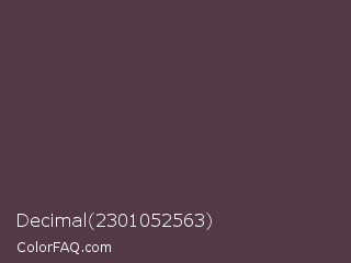 Decimal 2301052563 Color is a dark rose color and the nearest color is Matterhorn #4e3b41. Hex code #523945 and RGB value is rgb(82,57,69). In RGB color space, this color is composed of 32% red, 22% green, 27% blue, In CMYK color space, this color is composed of 0% cyan, 30% magenta, 16% yellow , 68% black , In HSL color space, this color has a hue angle of 331° , 18% saturation and 27% lightness.