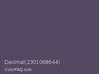 Decimal 2301068644 Color is a normal violet color and the nearest color is Mulled Wine #4e4562. Hex code #524864 and RGB value is rgb(82,72,100). In RGB color space, this color is composed of 32% red, 28% green, 39% blue, In CMYK color space, this color is composed of 18% cyan, 28% magenta, 0% yellow , 61% black , In HSL color space, this color has a hue angle of 261° , 16% saturation and 34% lightness.