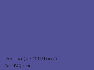 Decimal 2301101667 Color is a normal indigo color and the nearest color is Victoria #534491. Hex code #525097 and RGB value is rgb(82,80,151). In RGB color space, this color is composed of 32% red, 31% green, 59% blue, In CMYK color space, this color is composed of 46% cyan, 47% magenta, 0% yellow , 41% black , In HSL color space, this color has a hue angle of 242° , 31% saturation and 45% lightness.