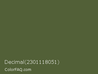 Decimal 2301118051 Color is a dark green color and the nearest color is Verdigris #5d5e37. Hex code #526037 and RGB value is rgb(82,96,55). In RGB color space, this color is composed of 32% red, 38% green, 22% blue, In CMYK color space, this color is composed of 15% cyan, 0% magenta, 43% yellow , 62% black , In HSL color space, this color has a hue angle of 80° , 27% saturation and 30% lightness.