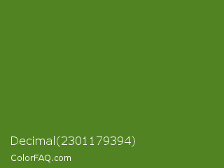 Decimal 2301179394 Color is a normal green color and the nearest color is Sap Green #507d2a. Hex code #528322 and RGB value is rgb(82,131,34). In RGB color space, this color is composed of 32% red, 51% green, 13% blue, In CMYK color space, this color is composed of 37% cyan, 0% magenta, 74% yellow , 49% black , In HSL color space, this color has a hue angle of 90° , 59% saturation and 32% lightness.