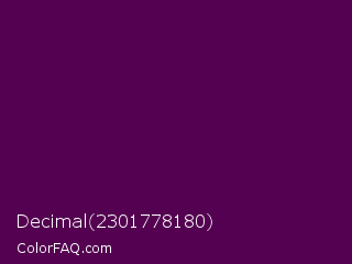 Decimal 2301778180 Color is a very dark magenta color and the nearest color is Clairvoyant #480656. Hex code #530150 and RGB value is rgb(83,1,80). In RGB color space, this color is composed of 33% red, 0% green, 31% blue, In CMYK color space, this color is composed of 0% cyan, 99% magenta, 4% yellow , 67% black , In HSL color space, this color has a hue angle of 302° , 98% saturation and 16% lightness.