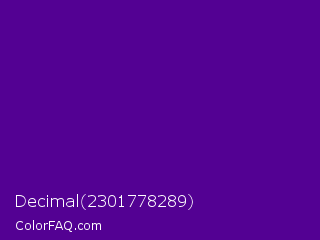 Decimal 2301778289 Color is a dark purple color and the nearest color is Pigment Indigo #4b0082. Hex code #530193 and RGB value is rgb(83,1,147). In RGB color space, this color is composed of 33% red, 0% green, 58% blue, In CMYK color space, this color is composed of 44% cyan, 99% magenta, 0% yellow , 42% black , In HSL color space, this color has a hue angle of 274° , 99% saturation and 29% lightness.