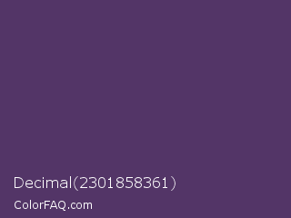 Decimal 2301858361 Color is a normal purple color and the nearest color is English Violet #563c5c. Hex code #533567 and RGB value is rgb(83,53,103). In RGB color space, this color is composed of 33% red, 21% green, 40% blue, In CMYK color space, this color is composed of 19% cyan, 49% magenta, 0% yellow , 60% black , In HSL color space, this color has a hue angle of 276° , 32% saturation and 31% lightness.