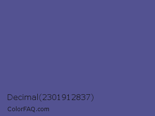 Decimal 2301912837 Color is a normal indigo color and the nearest color is Victoria #534491. Hex code #535291 and RGB value is rgb(83,82,145). In RGB color space, this color is composed of 33% red, 32% green, 57% blue, In CMYK color space, this color is composed of 43% cyan, 43% magenta, 0% yellow , 43% black , In HSL color space, this color has a hue angle of 241° , 28% saturation and 45% lightness.