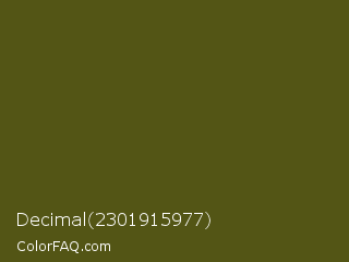 Decimal 2301915977 Color is a very dark yellow color and the nearest color is Saratoga #555b10. Hex code #535515 and RGB value is rgb(83,85,21). In RGB color space, this color is composed of 33% red, 33% green, 8% blue, In CMYK color space, this color is composed of 2% cyan, 0% magenta, 75% yellow , 67% black , In HSL color space, this color has a hue angle of 62° , 60% saturation and 21% lightness.
