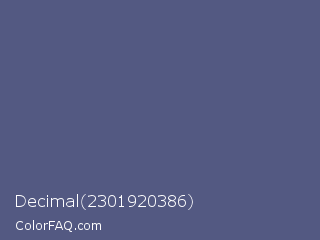 Decimal 2301920386 Color is a normal blue color and the nearest color is Purple Navy #4e5180. Hex code #535982 and RGB value is rgb(83,89,130). In RGB color space, this color is composed of 33% red, 35% green, 51% blue, In CMYK color space, this color is composed of 36% cyan, 32% magenta, 0% yellow , 49% black , In HSL color space, this color has a hue angle of 232° , 22% saturation and 42% lightness.