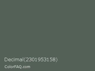 Decimal 2301953158 Color is a normal green color and the nearest color is Ebony #555d50. Hex code #536156 and RGB value is rgb(83,97,86). In RGB color space, this color is composed of 33% red, 38% green, 34% blue, In CMYK color space, this color is composed of 14% cyan, 0% magenta, 11% yellow , 62% black , In HSL color space, this color has a hue angle of 133° , 8% saturation and 35% lightness.