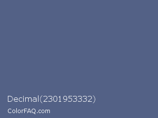 Decimal 2301953332 Color is a normal blue color and the nearest color is Paynes Grey #536878. Hex code #536186 and RGB value is rgb(83,97,134). In RGB color space, this color is composed of 33% red, 38% green, 53% blue, In CMYK color space, this color is composed of 38% cyan, 28% magenta, 0% yellow , 47% black , In HSL color space, this color has a hue angle of 224° , 24% saturation and 43% lightness.