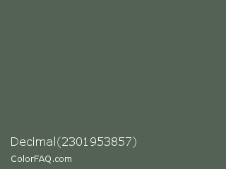 Decimal 2301953857 Color is a normal green color and the nearest color is Ebony #555d50. Hex code #536255 and RGB value is rgb(83,98,85). In RGB color space, this color is composed of 33% red, 38% green, 33% blue, In CMYK color space, this color is composed of 15% cyan, 0% magenta, 13% yellow , 62% black , In HSL color space, this color has a hue angle of 128° , 8% saturation and 35% lightness.