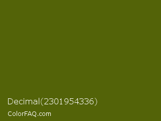 Decimal 2301954336 Color is a very dark lime color and the nearest color is Saratoga #555b10. Hex code #536308 and RGB value is rgb(83,99,8). In RGB color space, this color is composed of 33% red, 39% green, 3% blue, In CMYK color space, this color is composed of 16% cyan, 0% magenta, 92% yellow , 61% black , In HSL color space, this color has a hue angle of 71° , 85% saturation and 21% lightness.