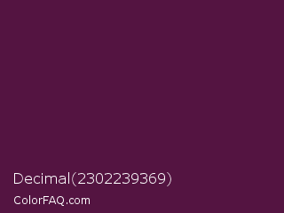 Decimal 2302239369 Color is a very dark magenta color and the nearest color is Wine Berry #591d35. Hex code #541441 and RGB value is rgb(84,20,65). In RGB color space, this color is composed of 33% red, 8% green, 25% blue, In CMYK color space, this color is composed of 0% cyan, 76% magenta, 23% yellow , 67% black , In HSL color space, this color has a hue angle of 318° , 62% saturation and 20% lightness.