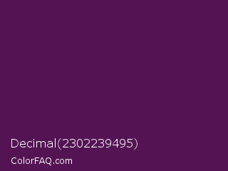 Decimal 2302239495 Color is a very dark magenta color and the nearest color is Clairvoyant #480656. Hex code #541453 and RGB value is rgb(84,20,83). In RGB color space, this color is composed of 33% red, 8% green, 33% blue, In CMYK color space, this color is composed of 0% cyan, 76% magenta, 1% yellow , 67% black , In HSL color space, this color has a hue angle of 301° , 62% saturation and 20% lightness.