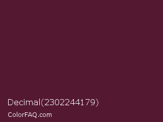 Decimal 2302244179 Color is a very dark rose color and the nearest color is Wine Berry #591d35. Hex code #541931 and RGB value is rgb(84,25,49). In RGB color space, this color is composed of 33% red, 10% green, 19% blue, In CMYK color space, this color is composed of 0% cyan, 70% magenta, 42% yellow , 67% black , In HSL color space, this color has a hue angle of 336° , 54% saturation and 21% lightness.