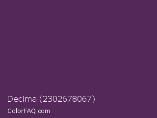Decimal 2302678067 Color is a dark magenta color and the nearest color is Bossanova #4e2a5a. Hex code #542859 and RGB value is rgb(84,40,89). In RGB color space, this color is composed of 33% red, 16% green, 35% blue, In CMYK color space, this color is composed of 6% cyan, 55% magenta, 0% yellow , 65% black , In HSL color space, this color has a hue angle of 294° , 38% saturation and 25% lightness.