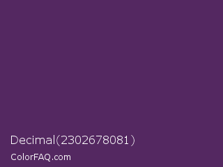 Decimal 2302678081 Color is a dark purple color and the nearest color is Bossanova #4e2a5a. Hex code #542861 and RGB value is rgb(84,40,97). In RGB color space, this color is composed of 33% red, 16% green, 38% blue, In CMYK color space, this color is composed of 13% cyan, 59% magenta, 0% yellow , 62% black , In HSL color space, this color has a hue angle of 286° , 42% saturation and 27% lightness.