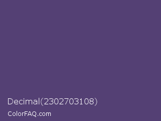 Decimal 2302703108 Color is a normal violet color and the nearest color is Cyber Grape #58427c. Hex code #544074 and RGB value is rgb(84,64,116). In RGB color space, this color is composed of 33% red, 25% green, 45% blue, In CMYK color space, this color is composed of 28% cyan, 45% magenta, 0% yellow , 55% black , In HSL color space, this color has a hue angle of 263° , 29% saturation and 35% lightness.