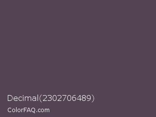 Decimal 2302706489 Color is a dark magenta color and the nearest color is Mortar #504351. Hex code #544353 and RGB value is rgb(84,67,83). In RGB color space, this color is composed of 33% red, 26% green, 33% blue, In CMYK color space, this color is composed of 0% cyan, 20% magenta, 1% yellow , 67% black , In HSL color space, this color has a hue angle of 304° , 11% saturation and 30% lightness.