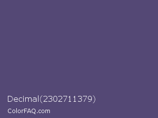 Decimal 2302711379 Color is a normal indigo color and the nearest color is Cyber Grape #58427c. Hex code #544875 and RGB value is rgb(84,72,117). In RGB color space, this color is composed of 33% red, 28% green, 46% blue, In CMYK color space, this color is composed of 28% cyan, 38% magenta, 0% yellow , 54% black , In HSL color space, this color has a hue angle of 256° , 24% saturation and 37% lightness.