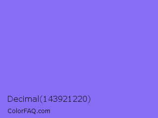 Decimal 143921220 Color is a light indigo color and the nearest color is Medium Slate Blue #7b68ee. Hex code #886df4 and RGB value is rgb(136,109,244). In RGB color space, this color is composed of 53% red, 43% green, 96% blue, In CMYK color space, this color is composed of 44% cyan, 55% magenta, 0% yellow , 4% black , In HSL color space, this color has a hue angle of 252° , 86% saturation and 69% lightness.