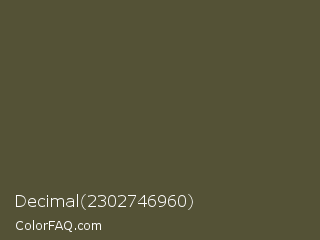 Decimal 2302746960 Color is a dark yellow color and the nearest color is Verdigris #5d5e37. Hex code #545236 and RGB value is rgb(84,82,54). In RGB color space, this color is composed of 33% red, 32% green, 21% blue, In CMYK color space, this color is composed of 0% cyan, 2% magenta, 36% yellow , 67% black , In HSL color space, this color has a hue angle of 56° , 22% saturation and 27% lightness.