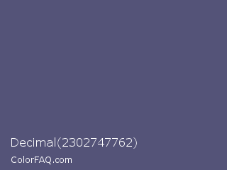Decimal 2302747762 Color is a normal indigo color and the nearest color is Purple Navy #4e5180. Hex code #545378 and RGB value is rgb(84,83,120). In RGB color space, this color is composed of 33% red, 33% green, 47% blue, In CMYK color space, this color is composed of 30% cyan, 31% magenta, 0% yellow , 53% black , In HSL color space, this color has a hue angle of 242° , 18% saturation and 40% lightness.