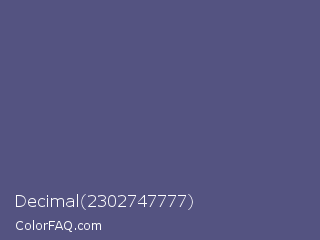 Decimal 2302747777 Color is a normal indigo color and the nearest color is Purple Navy #4e5180. Hex code #545381 and RGB value is rgb(84,83,129). In RGB color space, this color is composed of 33% red, 33% green, 51% blue, In CMYK color space, this color is composed of 35% cyan, 36% magenta, 0% yellow , 49% black , In HSL color space, this color has a hue angle of 241° , 22% saturation and 42% lightness.