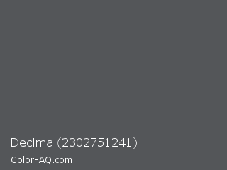 Decimal 2302751241 Color is a normal blue color and the nearest color is Davys Grey #555555. Hex code #545659 and RGB value is rgb(84,86,89). In RGB color space, this color is composed of 33% red, 34% green, 35% blue, In CMYK color space, this color is composed of 6% cyan, 3% magenta, 0% yellow , 65% black , In HSL color space, this color has a hue angle of 216° , 3% saturation and 34% lightness.