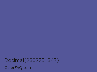 Decimal 2302751347 Color is a normal blue color and the nearest color is Liberty #545aa7. Hex code #545699 and RGB value is rgb(84,86,153). In RGB color space, this color is composed of 33% red, 34% green, 60% blue, In CMYK color space, this color is composed of 45% cyan, 44% magenta, 0% yellow , 40% black , In HSL color space, this color has a hue angle of 238° , 29% saturation and 46% lightness.