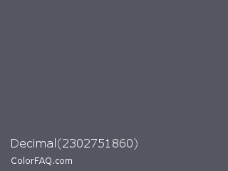Decimal 2302751860 Color is a normal blue color and the nearest color is Scarpa Flow #585562. Hex code #545762 and RGB value is rgb(84,87,98). In RGB color space, this color is composed of 33% red, 34% green, 38% blue, In CMYK color space, this color is composed of 14% cyan, 11% magenta, 0% yellow , 62% black , In HSL color space, this color has a hue angle of 227° , 8% saturation and 36% lightness.