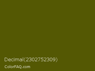 Decimal 2302752309 Color is a very dark yellow color and the nearest color is Verdun Green #495400. Hex code #545803 and RGB value is rgb(84,88,3). In RGB color space, this color is composed of 33% red, 35% green, 1% blue, In CMYK color space, this color is composed of 5% cyan, 0% magenta, 97% yellow , 65% black , In HSL color space, this color has a hue angle of 63° , 93% saturation and 18% lightness.