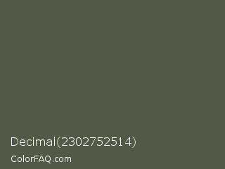 Decimal 2302752514 Color is a normal lime color and the nearest color is Fuscous Gray #54534d. Hex code #545846 and RGB value is rgb(84,88,70). In RGB color space, this color is composed of 33% red, 35% green, 27% blue, In CMYK color space, this color is composed of 5% cyan, 0% magenta, 20% yellow , 65% black , In HSL color space, this color has a hue angle of 73° , 11% saturation and 31% lightness.