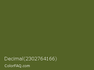 Decimal 2302764166 Color is a dark lime color and the nearest color is Dark Moss Green #4a5d23. Hex code #546326 and RGB value is rgb(84,99,38). In RGB color space, this color is composed of 33% red, 39% green, 15% blue, In CMYK color space, this color is composed of 15% cyan, 0% magenta, 62% yellow , 61% black , In HSL color space, this color has a hue angle of 75° , 45% saturation and 27% lightness.