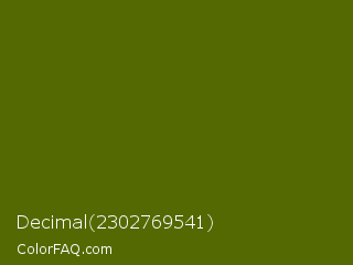 Decimal 2302769541 Color is a very dark lime color and the nearest color is Saratoga #555b10. Hex code #546901 and RGB value is rgb(84,105,1). In RGB color space, this color is composed of 33% red, 41% green, 0% blue, In CMYK color space, this color is composed of 20% cyan, 0% magenta, 99% yellow , 59% black , In HSL color space, this color has a hue angle of 72° , 98% saturation and 21% lightness.