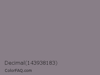 Decimal 143938183 Color is a normal magenta color and the nearest color is Suva Gray #888387. Hex code #887e87 and RGB value is rgb(136,126,135). In RGB color space, this color is composed of 53% red, 49% green, 53% blue, In CMYK color space, this color is composed of 0% cyan, 7% magenta, 1% yellow , 47% black , In HSL color space, this color has a hue angle of 306° , 4% saturation and 51% lightness.