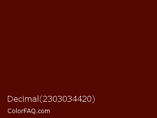 Decimal 2303034420 Color is a very dark red color and the nearest color is Mahogany #4e0606. Hex code #550702 and RGB value is rgb(85,7,2). In RGB color space, this color is composed of 33% red, 3% green, 1% blue, In CMYK color space, this color is composed of 0% cyan, 92% magenta, 98% yellow , 67% black , In HSL color space, this color has a hue angle of 4° , 95% saturation and 17% lightness.