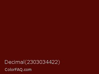 Decimal 2303034422 Color is a very dark red color and the nearest color is Mahogany #4e0606. Hex code #550704 and RGB value is rgb(85,7,4). In RGB color space, this color is composed of 33% red, 3% green, 2% blue, In CMYK color space, this color is composed of 0% cyan, 92% magenta, 95% yellow , 67% black , In HSL color space, this color has a hue angle of 2° , 91% saturation and 17% lightness.