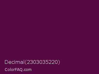 Decimal 2303035220 Color is a very dark magenta color and the nearest color is Mulberry Wood #5c0536. Hex code #550842 and RGB value is rgb(85,8,66). In RGB color space, this color is composed of 33% red, 3% green, 26% blue, In CMYK color space, this color is composed of 0% cyan, 91% magenta, 22% yellow , 67% black , In HSL color space, this color has a hue angle of 315° , 83% saturation and 18% lightness.