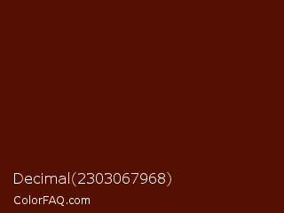 Decimal 2303067968 Color is a very dark red color and the nearest color is French Puce #4e1609. Hex code #551004 and RGB value is rgb(85,16,4). In RGB color space, this color is composed of 33% red, 6% green, 2% blue, In CMYK color space, this color is composed of 0% cyan, 81% magenta, 95% yellow , 67% black , In HSL color space, this color has a hue angle of 9° , 91% saturation and 17% lightness.