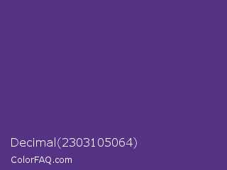 Decimal 2303105064 Color is a normal violet color and the nearest color is Regalia #522d80. Hex code #553384 and RGB value is rgb(85,51,132). In RGB color space, this color is composed of 33% red, 20% green, 52% blue, In CMYK color space, this color is composed of 36% cyan, 61% magenta, 0% yellow , 48% black , In HSL color space, this color has a hue angle of 265° , 44% saturation and 36% lightness.