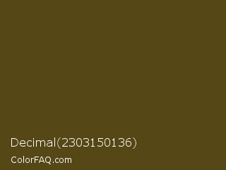 Decimal 2303150136 Color is a very dark yellow color and the nearest color is Horses Neck #604913. Hex code #554716 and RGB value is rgb(85,71,22). In RGB color space, this color is composed of 33% red, 28% green, 9% blue, In CMYK color space, this color is composed of 0% cyan, 16% magenta, 74% yellow , 67% black , In HSL color space, this color has a hue angle of 47° , 59% saturation and 21% lightness.