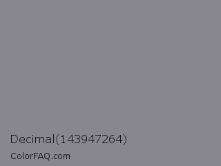 Decimal 143947264 Color is a normal indigo color and the nearest color is Oslo Gray #878d91. Hex code #888790 and RGB value is rgb(136,135,144). In RGB color space, this color is composed of 53% red, 53% green, 56% blue, In CMYK color space, this color is composed of 6% cyan, 6% magenta, 0% yellow , 44% black , In HSL color space, this color has a hue angle of 247° , 4% saturation and 55% lightness.